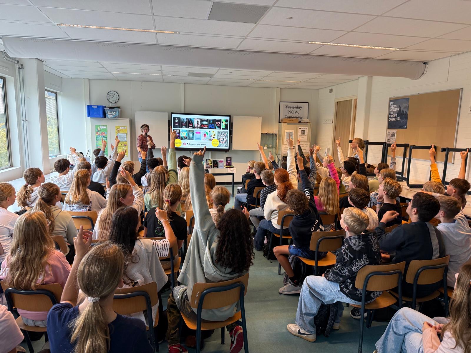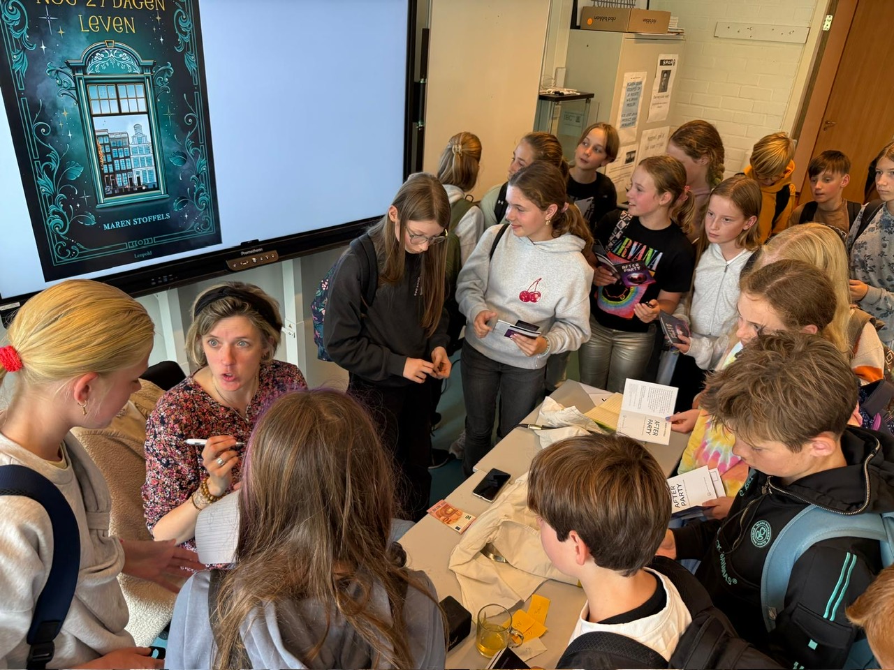 Afgelopen dinsdag kregen alle brugklassen een bijzondere lezing van schrijfster Maren Stoffels. Ze vertelde over haar leven en hoe ze schrijfster is geworden. Al in 6-vwo bracht ze haar eerste boek uit, wat veel indruk maakte op de leerlingen. Tijdens de lezing konden leerlingen meedoen aan een loterij door goede antwoorden te geven op de vragen die Maren stelde. Het enthousiasme van de leerlingen was enorm!!